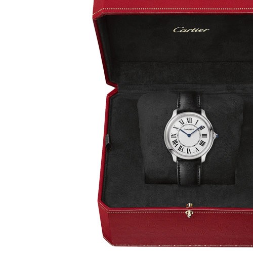 CARTIER/卡地亚 22年秋冬新款 七夕Rond系列 男女同款白色表盘石英机芯精钢表壳黑色非动物性皮革材质表带腕表36毫米WSRN0031